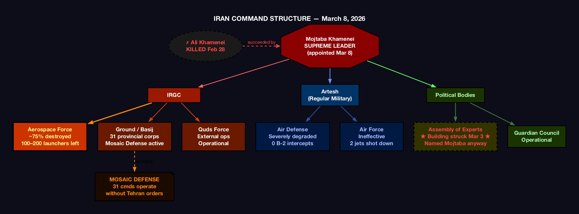 Supreme Leader Ali Khamenei was assassinated February 28, 2026, in a joint US-Israeli airstrike on his Tehran compound — Israeli jets dropped 30 bombs in daylight with zero effective Iranian air defense response. Mojtaba Khamenei, his son, was named Supreme Leader by the Assembly of Experts on March 8. Mojtaba is a Hojjatoleslam (mid-ranking cleric), not an Ayatollah — his theological credentials are below what the constitution’s spirit requires. He has never held a formal government position. The regime has chosen dynastic succession in a self-described revolutionary republic. This legitimacy deficit is the long-term vulnerability. [CONFIRMED — NYT, Reuters, P1B]