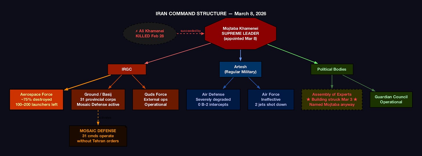 As of Day 6, Adm. Brad Cooper (CENTCOM) confirmed Iranian missile attacks declined roughly 90 percent since strikes began [ISW, March 5, 2026]. Per joint intelligence assessment (IDF/CENTCOM briefing), approximately 75% of all launchers destroyed; 100–200 remain. The IRGC Aerospace Force — Iran’s primary instrument of long-range conventional power projection — has been catastrophically degraded in nine days. “Hundreds” of warheads destroyed (conventional missile warheads — Iran has no deployed nuclear warheads). Defense industrial base under systematic attack. This is not a setback. This is the functional end of Iran’s power projection capability.