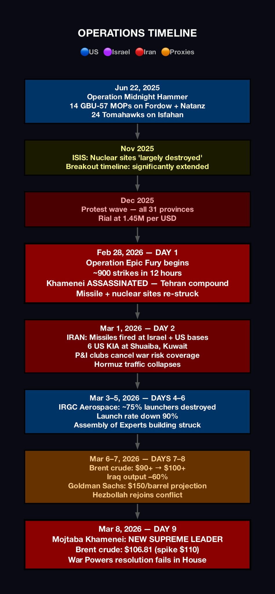 Days 2–4 (Mar 1–3): Conventional naval strikes — Iranian frigate confirmed sunk; IDF/CENTCOM claimed “rapid decapitation” of fleet capability → Strike on Assembly of Experts building disrupted succession deliberations → Mojtaba Khamenei was named Supreme Leader March 8 (Day 9), under extraordinary circumstances → missile stockpiles destroyed