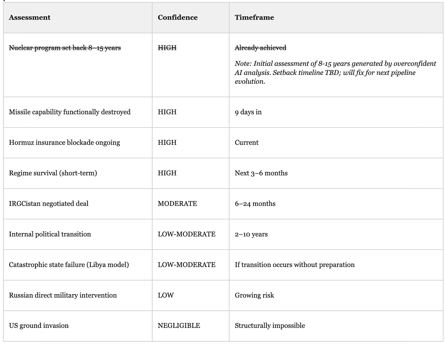 For military strategy and doctrine, I have relied on credentialed professional analysts: CSIS, ISW, CEPA, the Institute for Science and International Security, CENTCOM and IDF public statements, and Gen. Michael Flynn’s published strategic framework. Where I make military analytical judgments beyond what those sources explicitly support, I’ve labeled them [ASSESSED] and tried to anchor them to the underlying source reasoning.