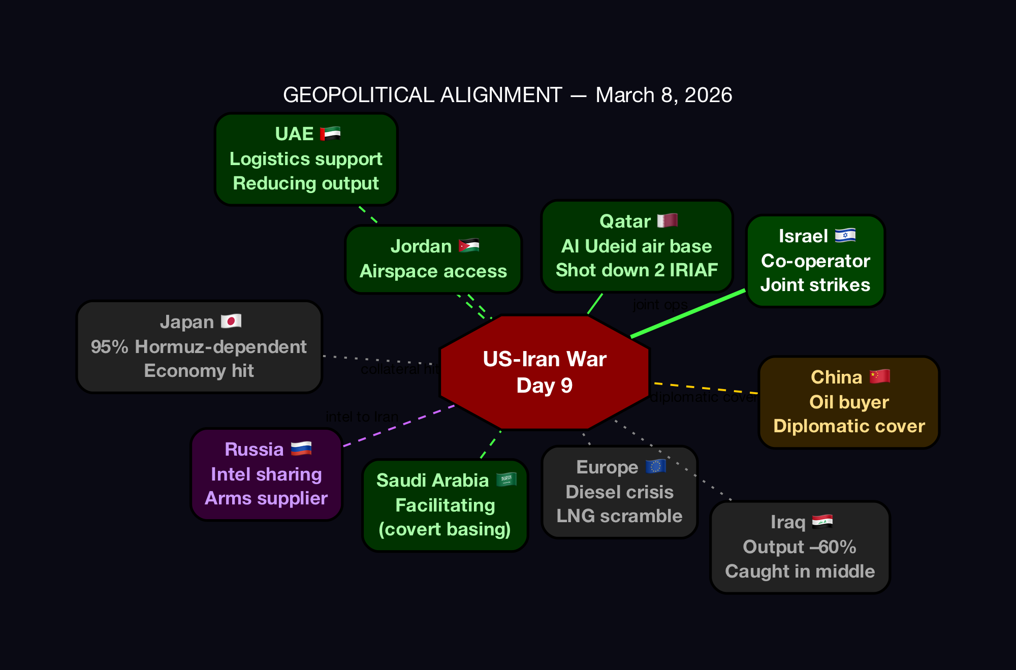 China’s response: calling for ceasefire in public, evacuating nationals, tracking US military operations with satellites, hedging on the Trump-Xi summit, warning that 2026 is “a big year for China-US relations” (Wang Yi, March 8). China is not intervening. The China-Iran 25-year Cooperation Agreement contains no mutual defense clause. [CONFIRMED — Reuters, China MFA, P1D]