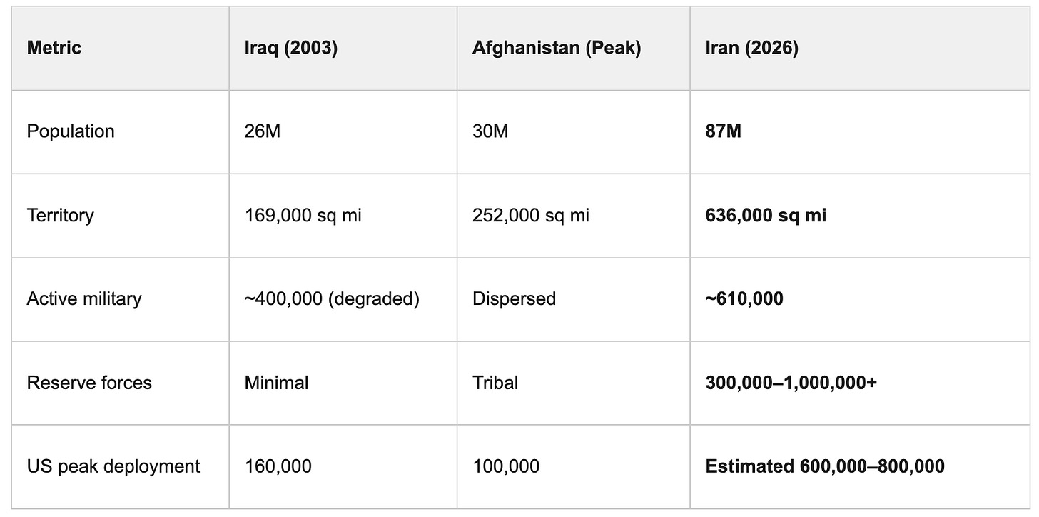 Iran has 87 million people, 636,000 square miles of mountainous terrain, 610,000 active-duty military, and a defense doctrine (Mosaic Defense) built specifically to defeat US ground operations. A proportional occupation force requires 600,000–800,000 troops — impossible without reinstating the draft. The draft is not coming. This is not a policy preference. It is arithmetic. The air campaign is not a second-best option waiting for a land invasion. It IS the doctrine.
