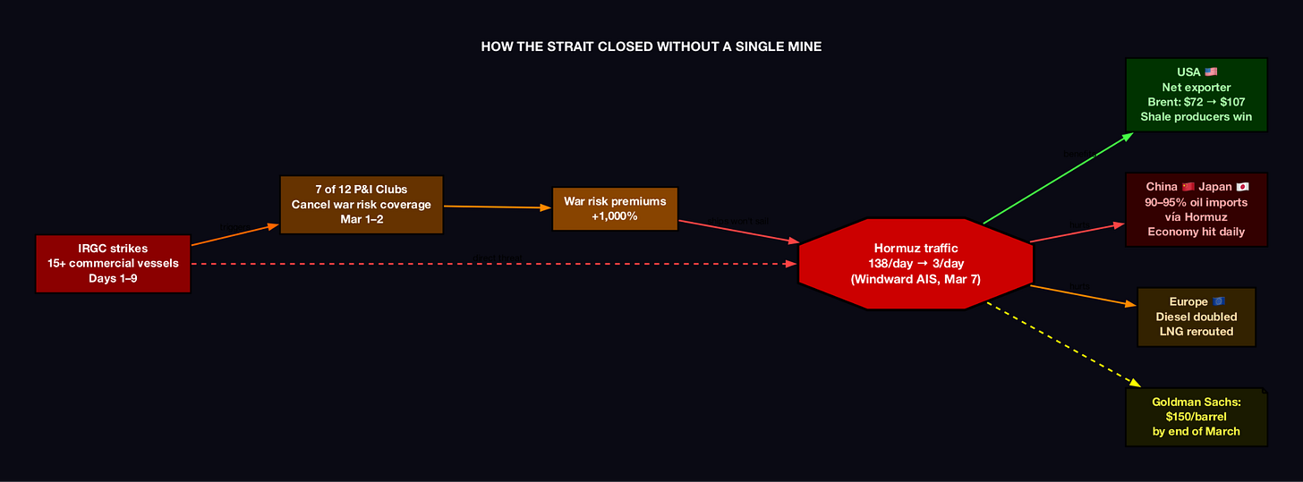 Seven of twelve International Group P&I Clubs cancelled war risk coverage on March 1–2, 2026. These seven clubs insure approximately 90% of the world’s ocean-going commercial tonnage. War risk premiums surged over 1,000%. The result: tanker traffic through Hormuz collapsed from a pre-conflict baseline of approximately 138–153+ vessels per day (figures vary by data provider: Lloyd’s List/Kpler cite ~138; CSIS/Starboard cite 153+) to as few as 3 commercial transits recorded by Windward.ai AIS tracking on March 7; a near-total shutdown. Iran achieved a de facto blockade by making the risk-reward calculation of commercial transit economically irrational, without firing a single mine.