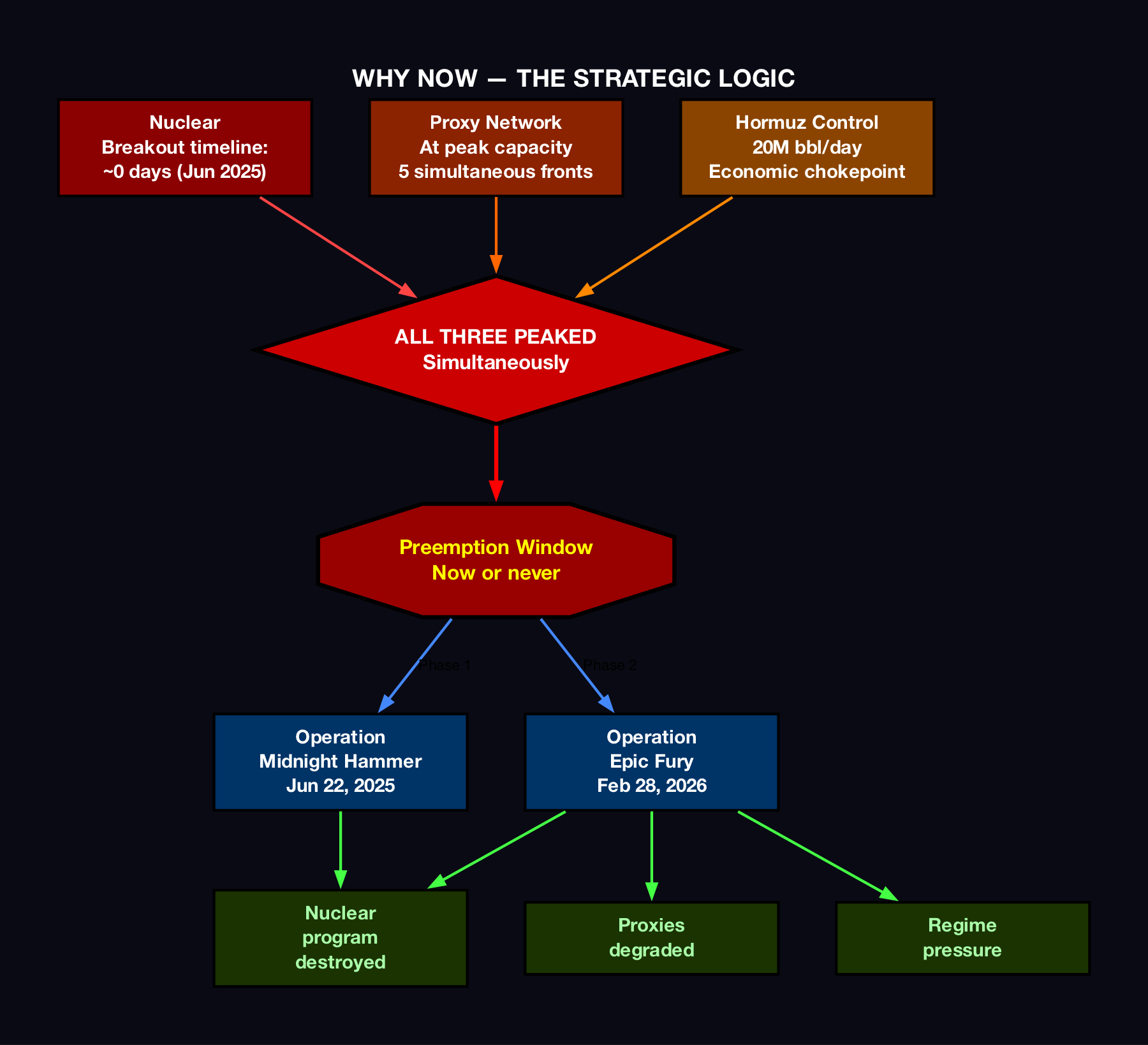 The convergence of all three (nuclear capability at threshold, proxy network at peak, Hormuz leverage intact) at the same moment created the strategic logic for preemption before any one of the three became impossible to address.