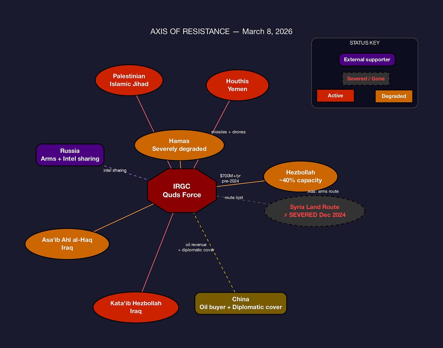 Syria corridor closed December 2024. Hezbollah dramatically weakened. Hamas degraded. Houthis sidelined. Iraqi PMF under active strikes. The Axis of Resistance as a coordinated strategic architecture is broken.